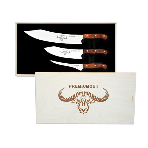 Giesser Messer Premiumcut Knife Set, includes (1) 7-3/4" chefs knife, (1) 11-3/4" barbecue knife, (1) 6-3/4" fillet knife, thuja (tree of life) wood handle, chrome-molybdenum steel blade, Made in Germany (to be discontinued, contact factory for availibility)