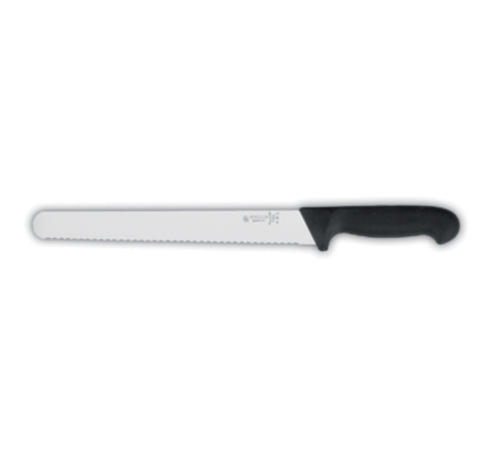 Giesser Messer Ham Knife, 9-3/4" blade length, serrated, non-slip comfort grip, non-porous, black thermoplastic elastomer handle, chrome-molybdenum steel blade, made in Germany