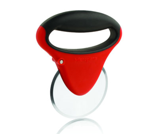 Microplane® Pizza Cutter, 6-1/2"L x 5-1/8"W x 1"H, ergonomic soft grip handle, 1-1/2" blade clearance, 3-3/4" dia. stainless steel removable, blade, red/black handle, dishwasher safe