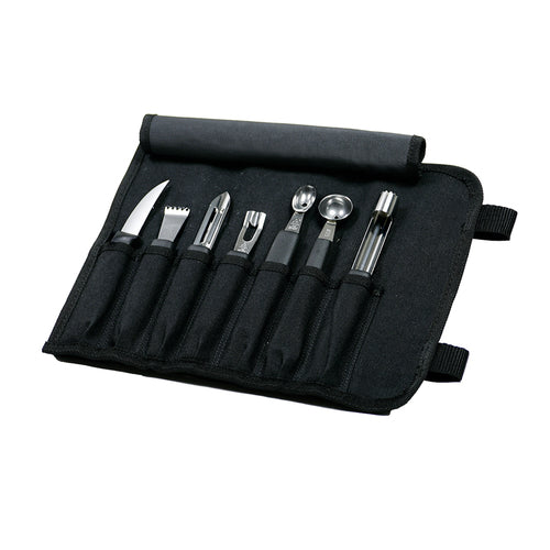 Mercer Cutlery Garnishing Kit, 8 piece, includes: (1) 2-1/2" peeling knife, (1) double melon baller, (1) citrus zester, (1) channel knife, (1) oval melon baller, (1) vegetable peeler, (1) apple corer, (1) heavy-duty 600 denier poly/canvas storage roll with hook-and-loop tabs