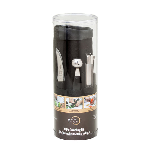 Mercer Cutlery Garnishing Kit, 8 piece, includes: (1) 2-1/2" peeling knife, (1) double melon baller, (1) citrus zester, (1) channel knife, (1) oval melon baller, (1) vegetable peeler, (1) apple corer, (1) heavy-duty 600 denier poly/canvas storage roll with hook-and-loop tabs, thick mil plastic tube packaging