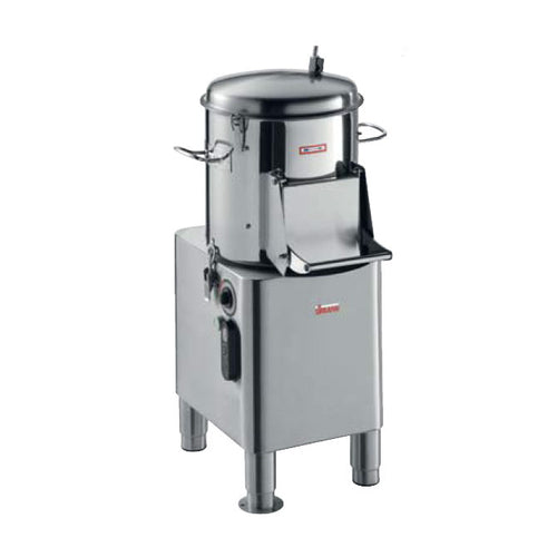 (41100008E) Potato Peeler, electric, countertop, 22 lb capacity, 375 lbs/hour average productivity, automatic unloading system, self-tensioning V-belt transmission, ventilated motor, dishwasher safe container & stainless steel peeling disc, 304 stainless steel body, adjustable feet, 320 RPM, 1.0 HP, 120v/60Hz, 735 watts