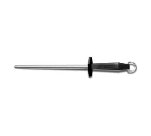 Sharpening Steel, 10" smooth polished, round, loose ring, black plastic handle, with hangtag