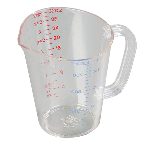 Measuring Cup, 32 oz. (1 qt.) capacity, oval, pour spout nestable, US/Metric measurements, C-handle, dishwasher safe, polycarbonate, clear, NSF