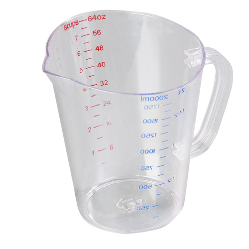 Measuring Cup, 64 oz. (1/2 gallon) capacity, oval, pour spout nestable, US/Metric measurements, C-handle, dishwasher safe, polycarbonate, clear, NSF