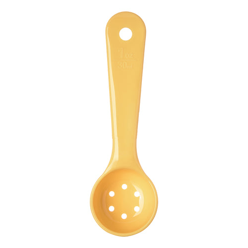 Measure Miser® Portion Spoon, 1 oz., perforated, short handle, flat bottom, resting notch, dry heat-resistant to 270° F, break-resistant, dishwasher safe, acetal, yellow, NSF, BPA free