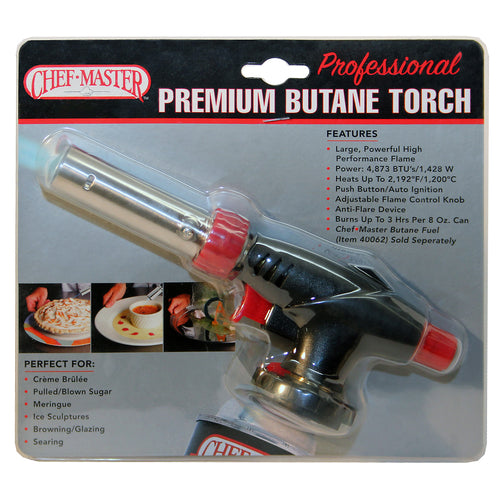 Chef-Master™ Premium Butane Torch, large, anti-flare device, push button automatic ignition, adjustable flame control knob (up to 2,192°F/1,200°C), burns up to 3 hours per 8 oz. canister of Chef Master # 40062 Butane Fuel (sold separately), 4,873 BTU (must be purchased in case quantities)