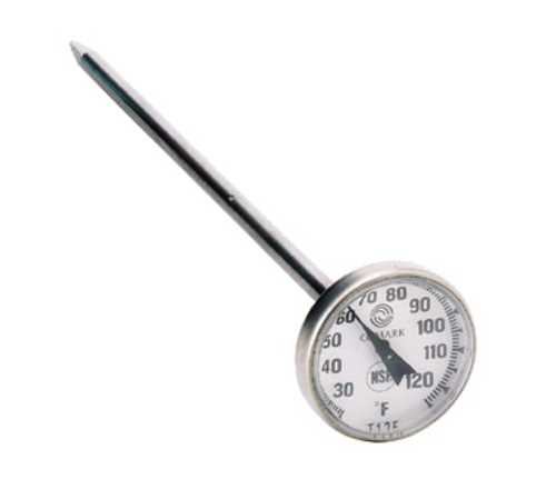 Pocket Thermometer, 1" dial, 5" stem, temperature range 25 to 125°F, stainless steel construction with plastic watertight lens, recalibration nut, NSF (must purchase in multiples of 12 each)