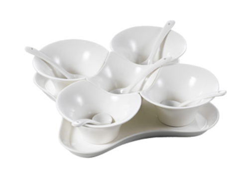 Paris-French Champagne Condiment Bowls and Tray Set, 11-piece, includes: (5) 4 oz., 4-3/8"L x 3-3/4"W x 2"H bowls, (1) 8-3/4"L x 8-3/4"W x 3/4"H tray and (5) spoons, dishwasher, oven and microwave safe, porcelain, Bone White (Sold by case)