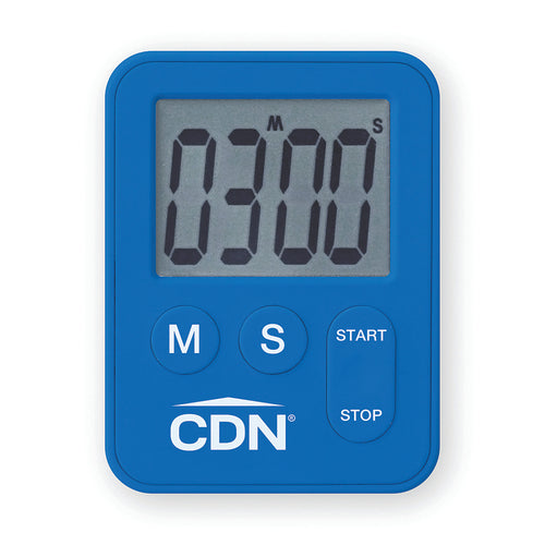 Mini Timer, 2-1/10"W x 3/8"D x 2-3/4"H, 100-minute, 60-second alarm, up or down count, stop and restart, last count recall, mounting magnet, includes: (2) batteries, blue
