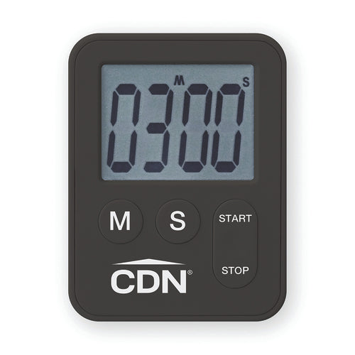 Mini Timer, 2-1/10"W x 3/8"D x 2-3/4"H, 100-minute, 60-second alarm, up or down count, stop and restart, last count recall, mounting magnet, includes: (2) batteries, black