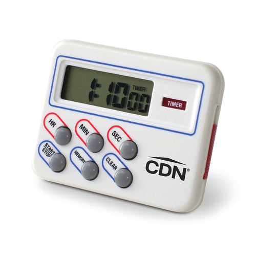 Multi-Task Timer & Clock, 100 hours by min, 1-3/8"W x 1/2"H (3.5 x 1.3cm) display, dual function, memory, counts up/down, clock, stopwatch, loud & long alarm, stop & restart, lock, sliding mode switch, international time, requires (1) 1.5V LR44 battery (included), pocket clip/magnet/stand, food-safe ABS