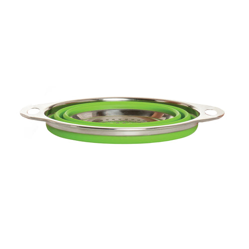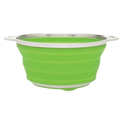 HIC Collapsible Colander, 9-1/2" x 5", 1" deep, 3 qt., heat resistant up to 500°F, flexible, non-stick, dishwasher safe, silicone bowl, stainless steel handles, green