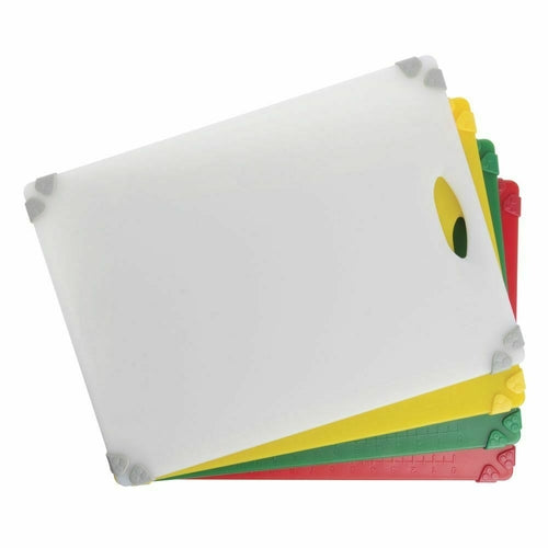 Cutting Board Set, 4-piece, includes (1) each: green, red, white & yellow, 20" x 15" x 1/2"H, rectangular, embossed ruler (measures cm/in), corner grippers, cutout handle, dishwasher safe, polypropylene, NSF