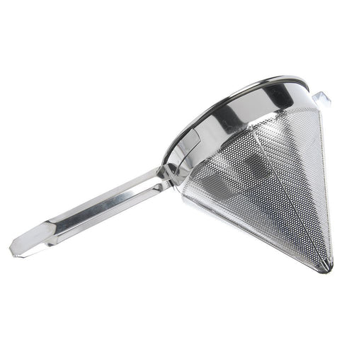 China Cap Strainer, 8" dia., cone shape, fine-mesh, reinforced, support tab, large handle, 18/8 stainless steel
