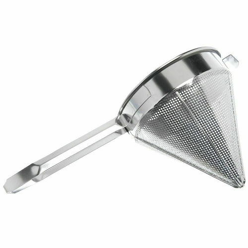 China Cap Strainer, 12" dia., cone shape, coarse-mesh, reinforced, support tab, large handle, 18/8 stainless steel