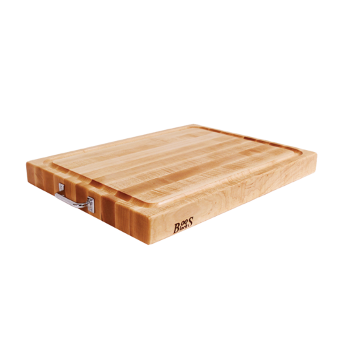Cutting Board, 24"W x 18"D x 2-1/4" thick, edge grain construction, Northern Hard Rock Maple, with Oil Finish, grooved, reversible, chrome handles