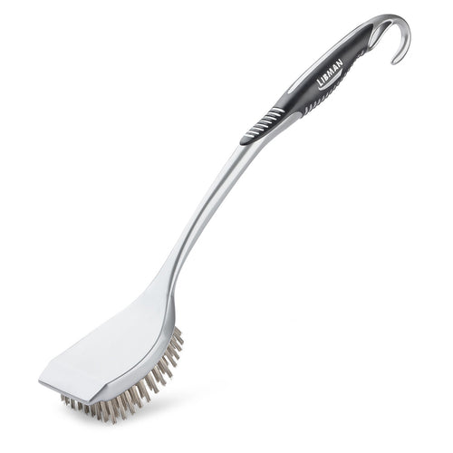 Grill Brush, 18" O.A.L, 3" x 4" brush surface, for use on stainless steel and cast iron surfaces only, with polypropylene scraper, 13" grooved handle, with thumb rest, sanoprene grip and hanger hole, 3/4" fibers, stainless steel