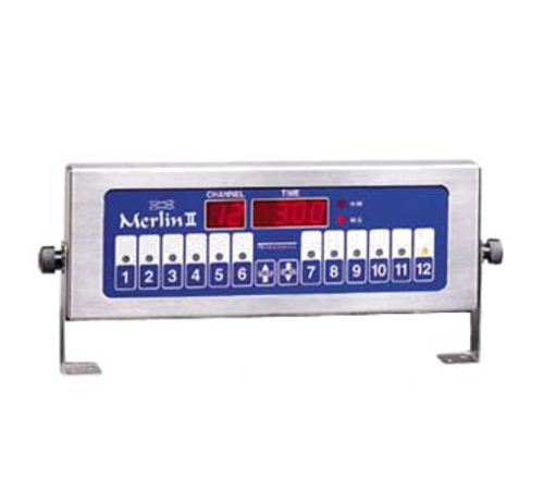 Merlin II Single Function Timer, electronic, 12-channel, single display, independently functioning programmable channels, multi colored LED channel indicators, digital channel display, dual tone alarm, includes 3-1/2" mounting brackets & menu labels, 10 ft. cord, "fat plug" transformer, 120v/60/1-ph, .083 amps, NEMA 5-15P, cUL, UL