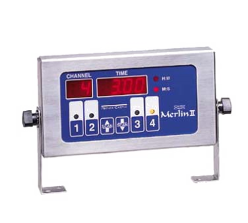 Merlin II Single Function Timer, electronic, 4-channel, single display, independently functioning programmable channels, multi colored LED channel indicators, digital channel display, dual tone alarm, includes 3-1/2" mounting brackets & menu labels, 10 ft. cord, "fat plug" transformer, 120v/60/1-ph, .083 amps, NEMA 5-15P cUL, UL