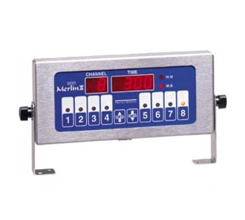 Merlin II Single Function Timer, electronic, 8-channel, single display, independently functioning programmable channels, multi colored LED channel indicators, digital channel display, dual tone alarm, includes 3-1/2" mounting brackets & menu labels, 10 ft. cord, "fat plug" transformer, 120v/60/1-ph, .083 amps, NEMA 5-15P cUL, UL
