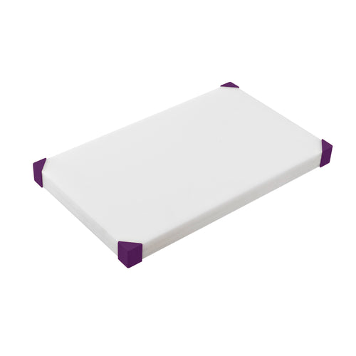 Araven Cutting Board, 15-7/8" x 11-7/8" x 7/8", high density polyethylene, white with purple color coded non-slip rubber permanent corners, both sides useable, HACCP compliant