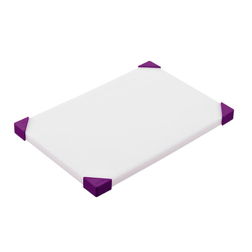 Araven Cutting Board, 11-7/8" x 8-1/8" x 3/4", high density polyethylene, white with purple color coded non-slip rubber permanent corners, both sides useable, HACCP compliant