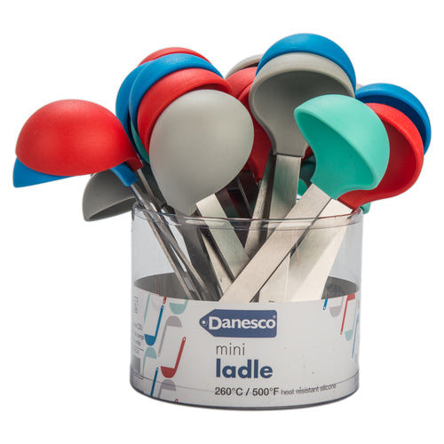 Danesco® Mini Ladle, 1 oz., 6-3/4"L, heat resistant up to 500°F, dishwasher safe, stainless steel handle, silicone bowl (CDU 24 pack includes: 8 red, 8 grey, 4 turquoise & 4 blue) (1 pack minimum order) (NET)