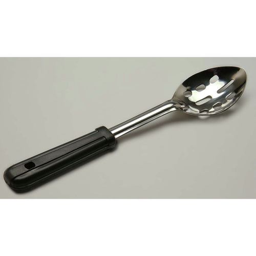 Serving Spoon, 11", perforated, black comfort grip handle with hanging hole, dishwasher safe, stainless steel