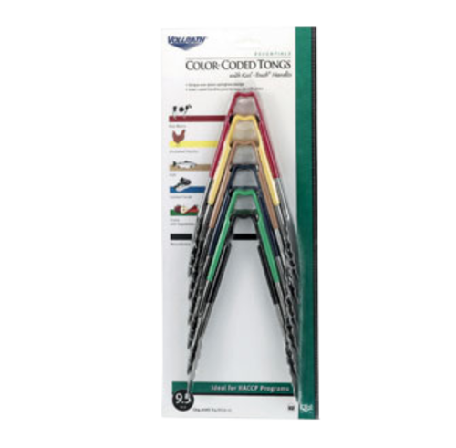 Utility Tong MULTI-PACK, Color-Coded, one-piece, 9-1/2"(24.1cm), scalloped teeth, springless design, ergonomic antimicrobial Kool-Touch® handle (heat resistant to 225°F (107.2°C), fully functional to 350° F (176.6 C), dishwasher safe, stainless steel, (1) each (red, yellow, blue, green, tan, black), NSF, Made in USA, Jacob's Pride® Collection, Limited Lifetime Warranty