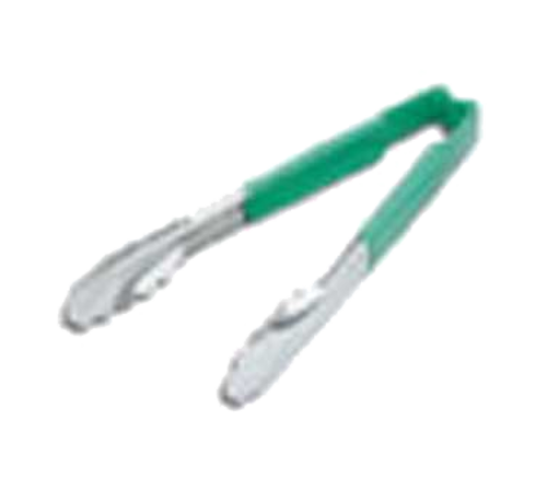Utility Tongs, one-piece, 12" (30.5 cm), scalloped teeth, springless design, green ergonomic antimicrobial Kool-Touch® handle (heat resistant to 225°F (107.2°C), fully functional to 350° F (176.6 C), dishwasher safe, stainless steel, NSF, Made in USA, Jacob's Pride® Collection, Limited Lifetime Warranty