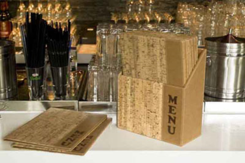 Securit® Cork Designer Menu Cover, 10" x 13", brown lettering on front cover, (2) 2-page plastic inserts