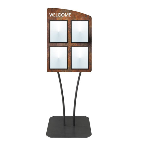 Menu Board, 4-pocket, floor stand, with "Welcome" greeting, 23-3/4" x 23" x 66"H overall, single-sided, holds (4) 8-1/2" x 11"H inserts, side curve, V-stem stand, clear acrylic covers with magnetic trim closure, metal, white imprinted, acid washed finish