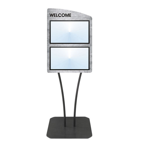 Menu Board, 2-pocket, floor stand, with "Welcome" greeting, 23-3/4" x 23" x 66"H overall, single-sided, holds (2) 17" x 11"H horizontal inserts, curved, V-stem stand, clear acrylic covers with magnetic trim closure, metal, black imprinted, galvanized finish