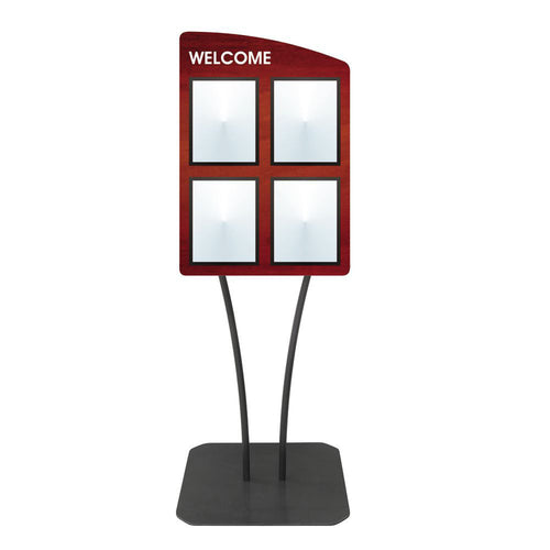 Menu Board, 4-pocket, floor stand, with "Welcome" greeting, 23-3/4" x 23" x 66"H overall, single-sided, holds (4) 8-1/2" x 11"H inserts, side curve, V-stem stand, clear acrylic covers with magnetic trim closure, metal, white imprinted, smooth mahogany finish