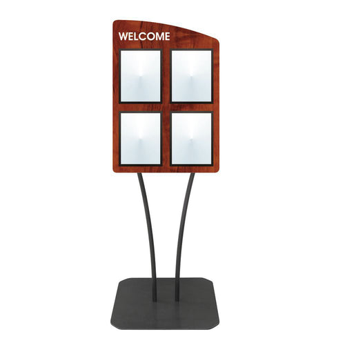 Menu Board, 4-pocket, floor stand, with "Welcome" greeting, 23-3/4" x 23" x 66"H overall, single-sided, holds (4) 8-1/2" x 11"H inserts, side curve, V-stem stand, clear acrylic covers with magnetic trim closure, metal, white imprinted, weathered mahogany finish
