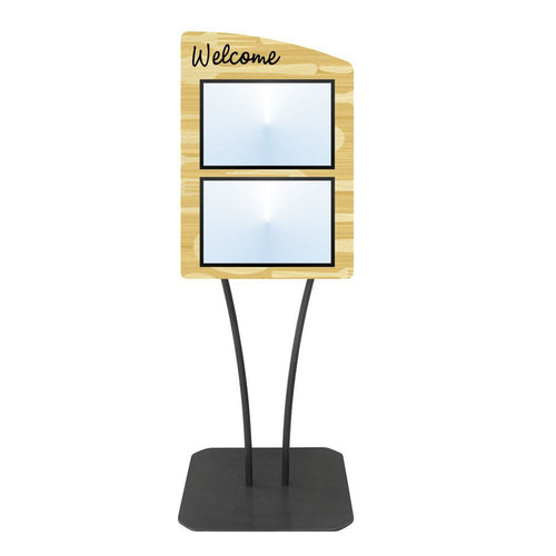 Menu Board, 2-pocket, floor stand, with "Welcome" greeting, 23-3/4" x 23" x 66"H overall, single-sided, holds (2) 17" x 11"H horizontal inserts, curved, V-stem stand, clear acrylic covers with magnetic trim closure, metal, black imprinted, wooden utensils design