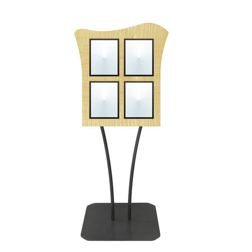 Menu Board, 4-pocket, floor stand, 23" x 23" x 68-1/2"H overall, single-sided, holds (4) 8-1/2" x 11"H inserts, double wave, V-stem stand, clear acrylic covers with magnetic trim closure, metal, maple finish