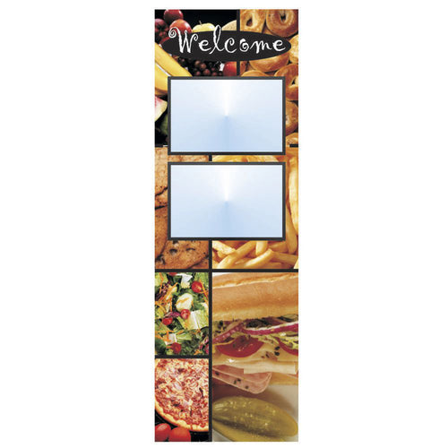 Menu Board, 2-pocket, floor stand, with "Welcome" greeting, 23" x 11" x 66"H overall, single-sided, holds (2) 17" x 11"H horizontal inserts, rectangular, convex, clear laminate covers with magnetic trim closure, powder-coated steel/Sintra® plastic, white imprinted, food medley design