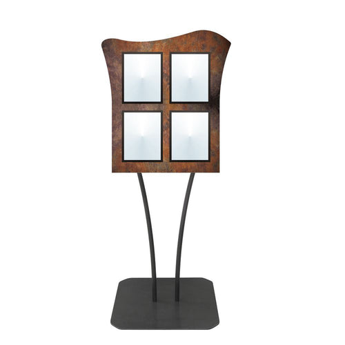 Menu Board, 4-pocket, floor stand, 23" x 23" x 68-1/2"H overall, single-sided, holds (4) 8-1/2" x 11"H inserts, double wave, V-stem stand, clear acrylic covers with magnetic trim closure, metal, acid washed finish