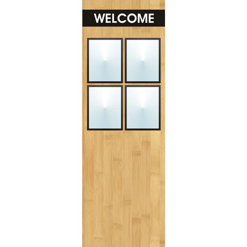 Menu Board, 4-pocket, floor stand, with "Welcome" greeting, 23" x 11" x 66"H overall, single-sided, holds (4) 8-1/2" x 11"H inserts, rectangular, convex, clear acrylic covers with magnetic trim closure, powder-coated steel, white imprinted, bamboo finish