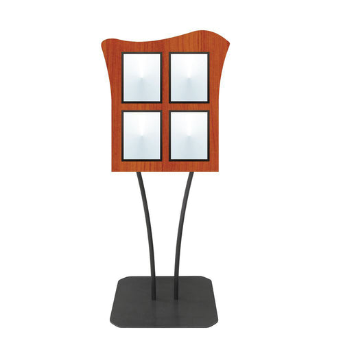 Menu Board, 4-pocket, floor stand, 23" x 23" x 68-1/2"H overall, single-sided, holds (4) 8-1/2" x 11"H inserts, double wave, V-stem stand, clear acrylic covers with magnetic trim closure, metal, cherry wood finish