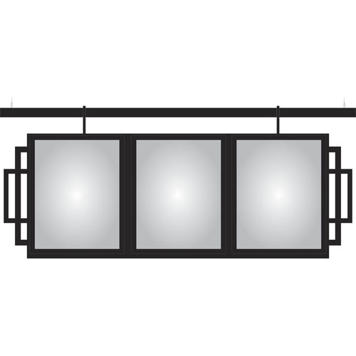 Menu Board, 3-pocket, hanging, 50" x 14-1/2"H overall, holds (3) 8-1/2" x 11"H, inserts, square design, with mounting hardware: (2) 21" cables, (2) "S" hooks, (2) ceiling grid clips & 1" black powder-coated metal bar, clear covers with magnetic trim closure, Sintra® material, matte black