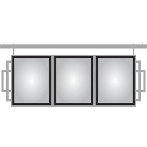 Menu Board, 3-pocket, hanging, 50" x 14-1/2"H overall, holds (3) 8-1/2" x 11"H, inserts, square design, with mounting hardware: (2) 21" cables, (2) "S" hooks, (2) ceiling grid clips & 1" black powder-coated metal bar, clear covers with magnetic trim closure, Sintra® material, matte silver