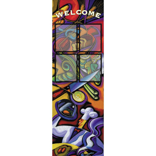 Menu Board, 8-pocket, floor stand, with "Welcome" greeting, 23" x 11" x 66"H overall, double-sided, holds (8) 8-1/2" x 11"H inserts (4 each on both sides), rectangular, convex, clear acrylic covers with magnetic trim closure, powder-coated steel/Sintra® plastic, white imprinted, chalk chef design