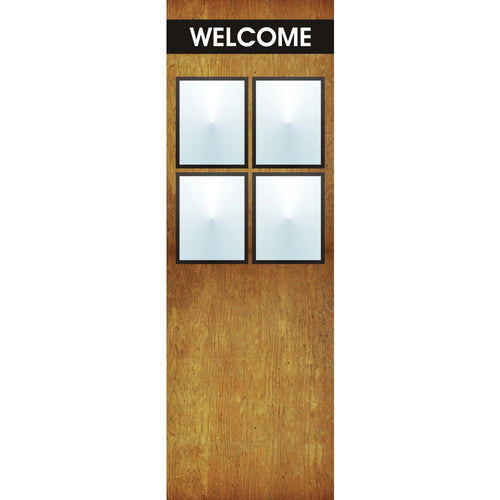 Menu Board, 4-pocket, floor stand, with "Welcome" greeting, 23" x 11" x 66"H overall, single-sided, holds (4) 8-1/2" x 11"H inserts, rectangular, convex, clear acrylic covers with magnetic trim closure, powder-coated steel, white imprinted, reclaimed wood finish