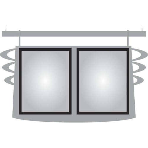 Menu Board, 2-pocket, hanging, 36" x 14-1/2"H overall, holds (2) 8-1/2" x 11"H, inserts, triple swirl design, with mounting hardware: (2) 21" cables, (2) "S" hooks, (2) ceiling grid clips & 1" black powder-coated metal bar, clear covers with magnetic trim closure, Sintra® material, matte silver