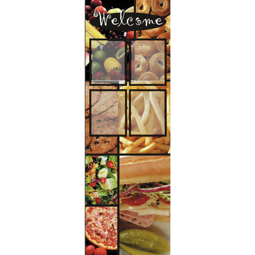 Menu Board, 4-pocket, floor stand, with "Welcome" greeting, 23" x 11" x 66"H overall, single-sided, holds (4) 8-1/2" x 11"H inserts, rectangular, convex, clear acrylic covers with magnetic trim closure, powder-coated steel, white imprinted, food medley design