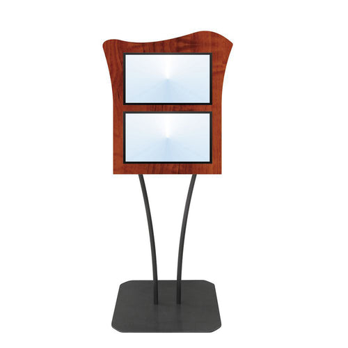 Menu Board, 2-pocket, floor stand, 23" x 23" x 68-1/2"H overall, single-sided, holds (2) 17" x 11"H horizontal inserts, double-wave, V-stem stand, clear acrylic covers with magnetic trim closure, metal, weathered mahogany finish