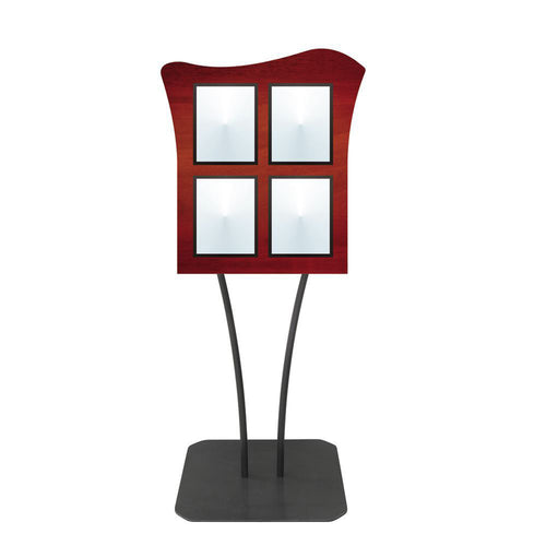 Menu Board, 4-pocket, floor stand, 23" x 23" x 68-1/2"H overall, single-sided, holds (4) 8-1/2" x 11"H inserts, double wave, V-stem stand, clear acrylic covers with magnetic trim closure, metal, smooth mahogany finish